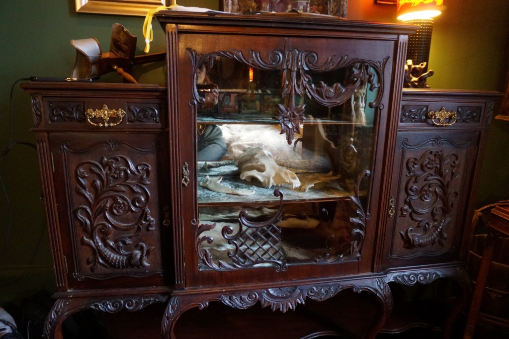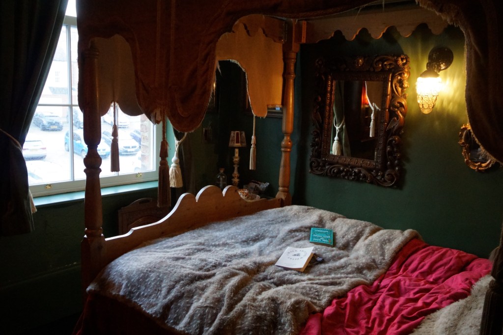 My hotel was a perfect choice then. Eschewing the endless, copy-paste, millennial-grey holiday lets, I had searched for something with colour. With character. With a story. La Rosa Hotel was the perfect choice – I’ve never felt more like a place “gets” me. The favourite haunt of Lewis Carroll on his regular Whitby visits, it perches close to the edge of the western cliffs, each room showcasing a unique theme. I was in “Little Red”, a small but cosy room of dark forest green, with an opulent red velvet coverlet on a four-poster bed, perfect for nestling down in and proclaiming “all the better to see you with, my dear!” In an intricate dark wood cabinet, a wolf skull completed the theme. I was blown away by how well thought out it was, even down the red cloak hanging on the back of the door.