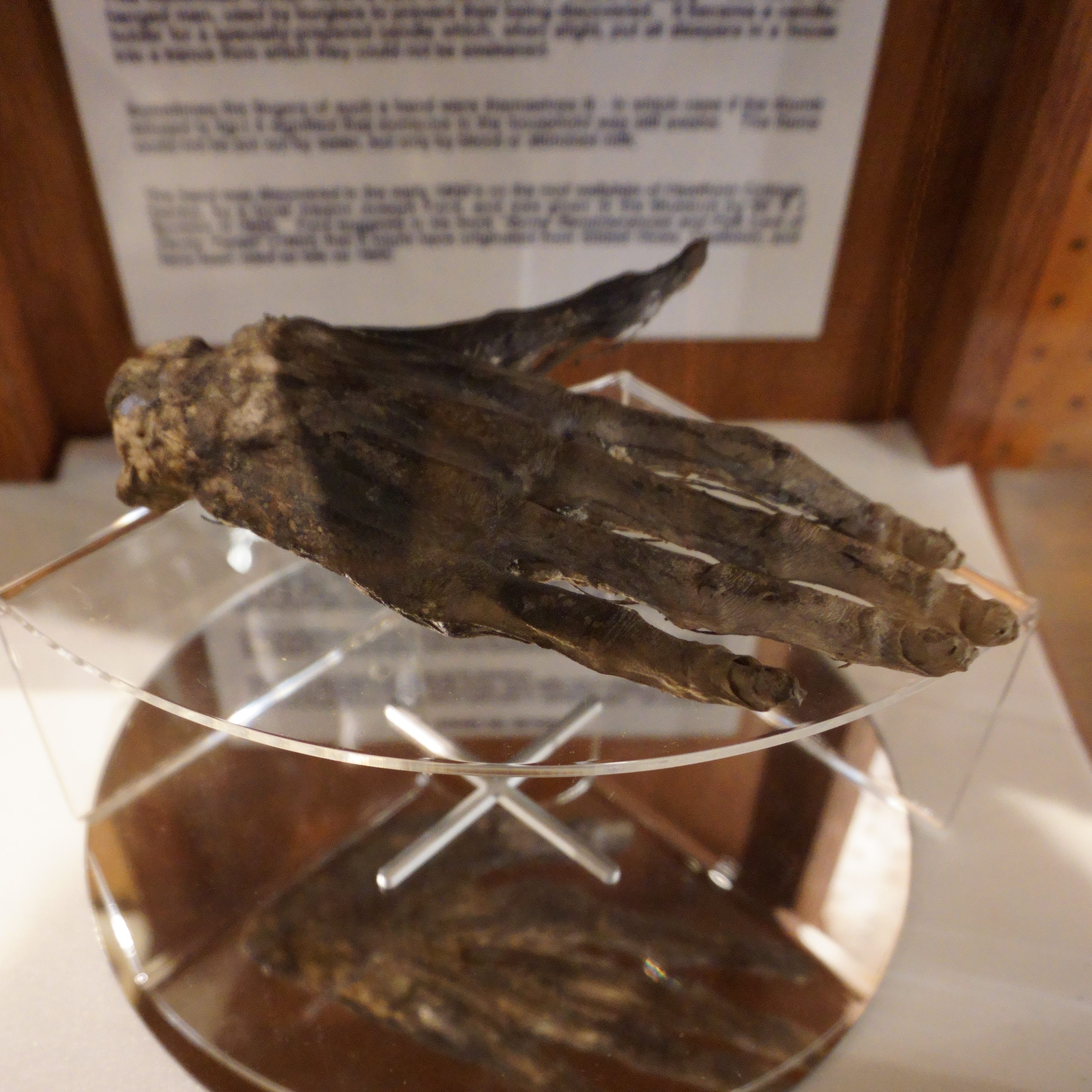 Before I threw myself into buying far too many Sutcliffe prints from the gift shop (“It’s my birthday,” I justified to myself. “I deserve a little treat.”*), I had one more exhibit to marvel over. Whitby Museum’s hand of glory is supposedly the only one of its kind remaining in the world, and was found hidden in the wall of a local house. The mummified right hand of a criminal, severed while the body still hung from the gallows, the hand of glory was prized by thieves. Human fat candles were jammed between the fingers, or the fingers themselves lit, in order to keep the occupants of a target house in a deep sleep, allowing the thieves to commit their crimes and make their escape undisturbed. The hand is as fascinating as it is unsettling. Long, bony fingers rest on the glass pedestal, the cord-like tendons and pulleys clearly visible in the mirror below. Who did it belong to? What crime did they commit to warrant being hanged? Who severed the hand, and more importantly – did it work?