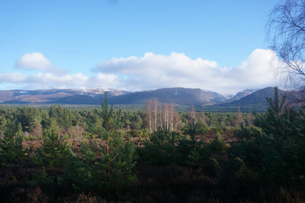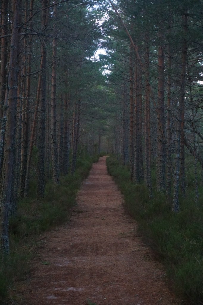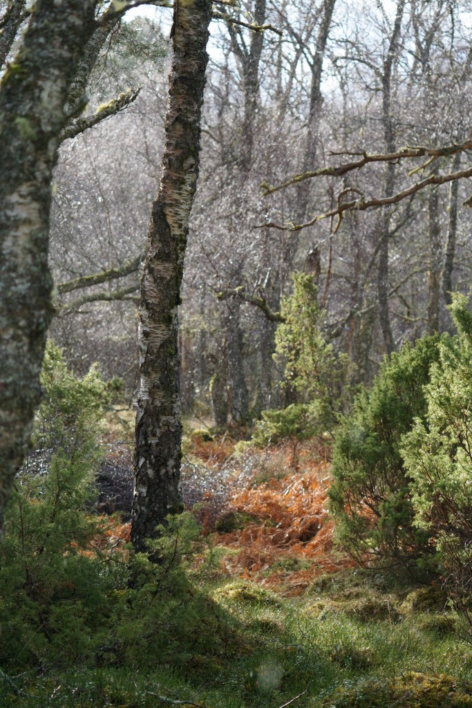 Leaving the howling gale behind, the four of us traded stark mountains for the softer, muted tones and sheltered paths of the thick Rothiemurchus forest.