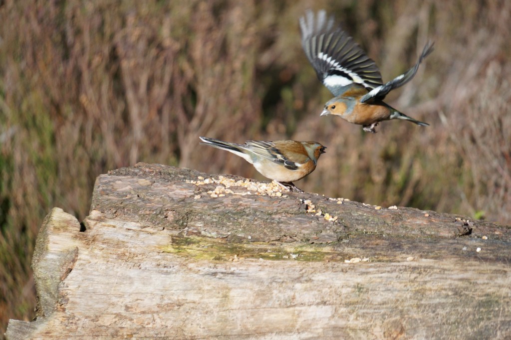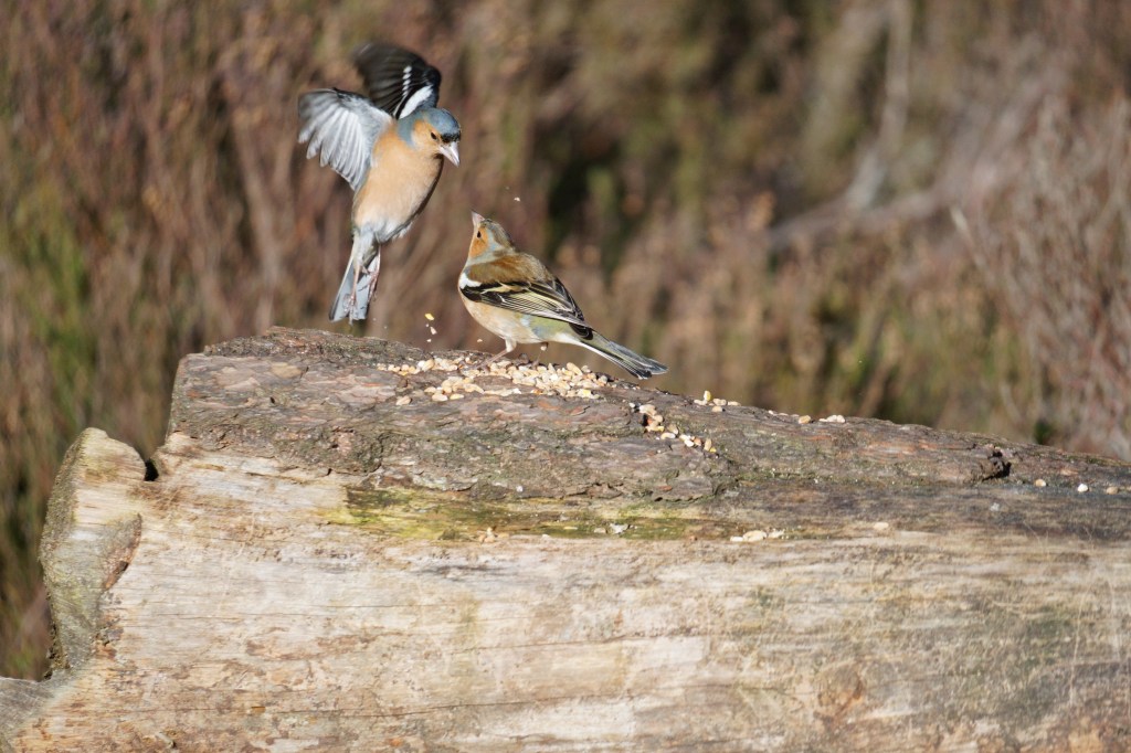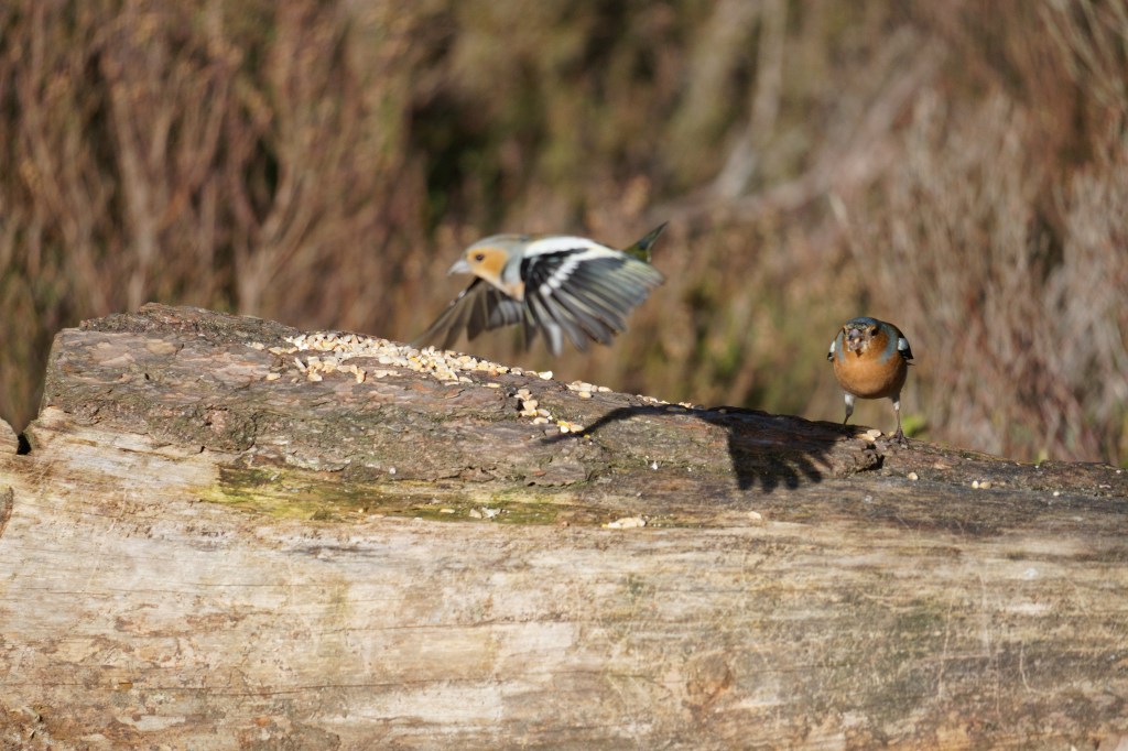 I was heading home the next day, but before I started off on the long drive home I went again to Loch Garten, for one last ditch effort to feast my eyes on some crested tits. This time a couple of photographers had spread some seeds out on a log and as I approached, one whispered conspiratorially that there was at least one crested hovering in the trees. Alas, I had to be back in Wales for 6pm and I was very aware of the ticking clock hovering over me. I pushed it as long as I could, but the shy cresteds once again cancelled their performance last minute. Not a total loss though, I had a lovely time watching chaffinches bully each other over the seeds, playing territorial games and flapping angrily at the other. Like a cowboy showdown on Main Street at midday, this log was certainly not big enough for the both of us.