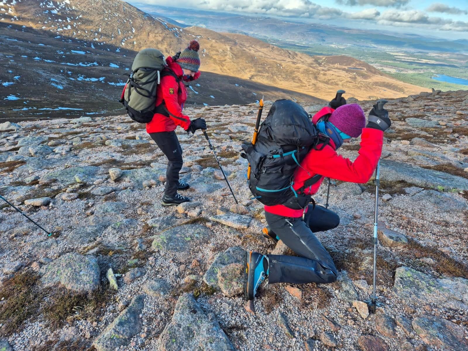 The group split, a few deciding to take an easy, safe route up to the summit and head down a more sheltered way, and others – me included – taking the traverse path out of the left side of the coire and down next to the ski piste. I really had managed to forget just how bad the wind was. We had to head up and briefly over the left hand ridge to reach the piste, and the wind hit us with a full and almost overpowering fury, propelling us forwards, forcing our bodies to crouch low, hunch over our poles. At one point I simply sat down and shuffled forwards as gusts tried to force freezing fingers under my clothes. One of the other women leaned over me. “You’ll rip your trousers!” she shouted into the wind, as it ripped her words away. I didn’t care. This wasn’t the first bum scoot these hardshell trousers had seen and it certainly won’t be the last. Later Met Office reports confirmed the winds at 80mph along the tops that day.