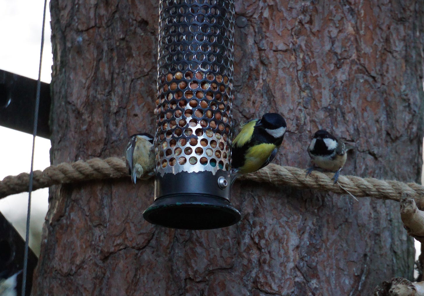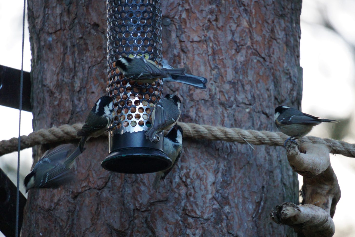A gang of coal tits held the feeder hostage, almost covering the sides in their feathery bodies. They glared furiously at the great tit and chaffinches that dared to encroach, too small to chase them off, but not too shy to still make their annoyance known.