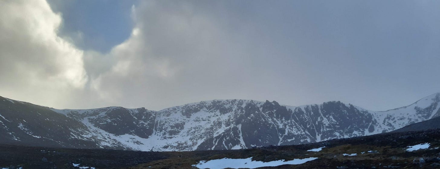 We were optimistic the next morning. The winds were high, the snow conditions lean and the weather warnings yellow, but we were all confident in the mountains and decided to at least go and have a look at Fiacaill Ridge in Stob Coire an t-Snaechda.2 As we set off from the ski resort car park, I couldn’t believe how different the conditions were to my visit last winter. Gone was the thick layer of ice on the path, the knee-deep snow compressed from layer after layer of snowfall. The rocky black faces of the crags had barely a dusting of icing sugar, and the determined figures of climbers in the all but the deepest of gullies were just as likely to be climbing steep grass as they were good, thick snow. At least there was little danger of avalanche?