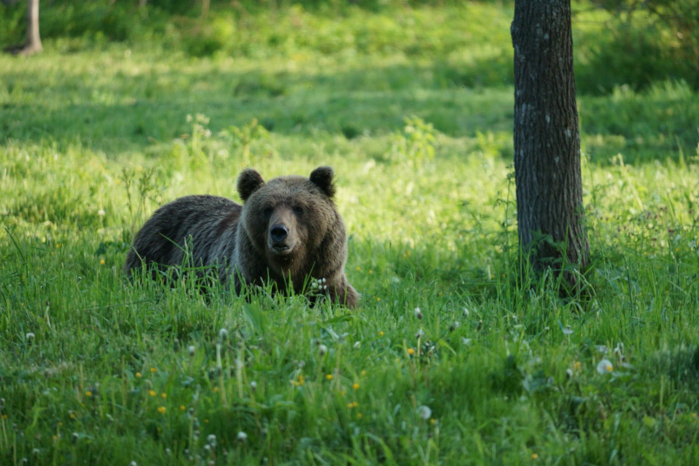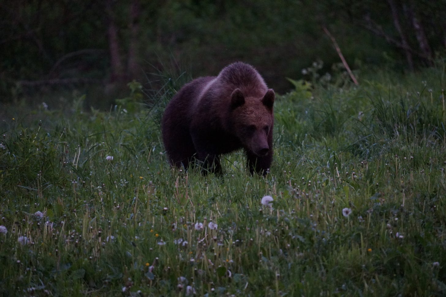 Once our guide left, we dumped our overnight gear on the rough wooden bunks and took up watchful positions as quietly as possible, one on either side of the hide. One side of the hide looked into the woods, the long, deep green grass shaded by dense tree cover. The other side was an open meadow, bathed in bright sunlight with a small pond nearby. We each sat, our eyes straining through binoculars, searching for any sign of movement, a flicker in the trees, a lumbering shadow, anything that could be our ursine quarry. For the first hour or so, we saw little but woodpigeons and jays. The sky-blue flash of a jay’s wing, a source of excitement in the UK, quickly became old news when we were surrounded by them, though we sat alert each time they scattered, hoping that might be the warning sign that something larger might be on its way.