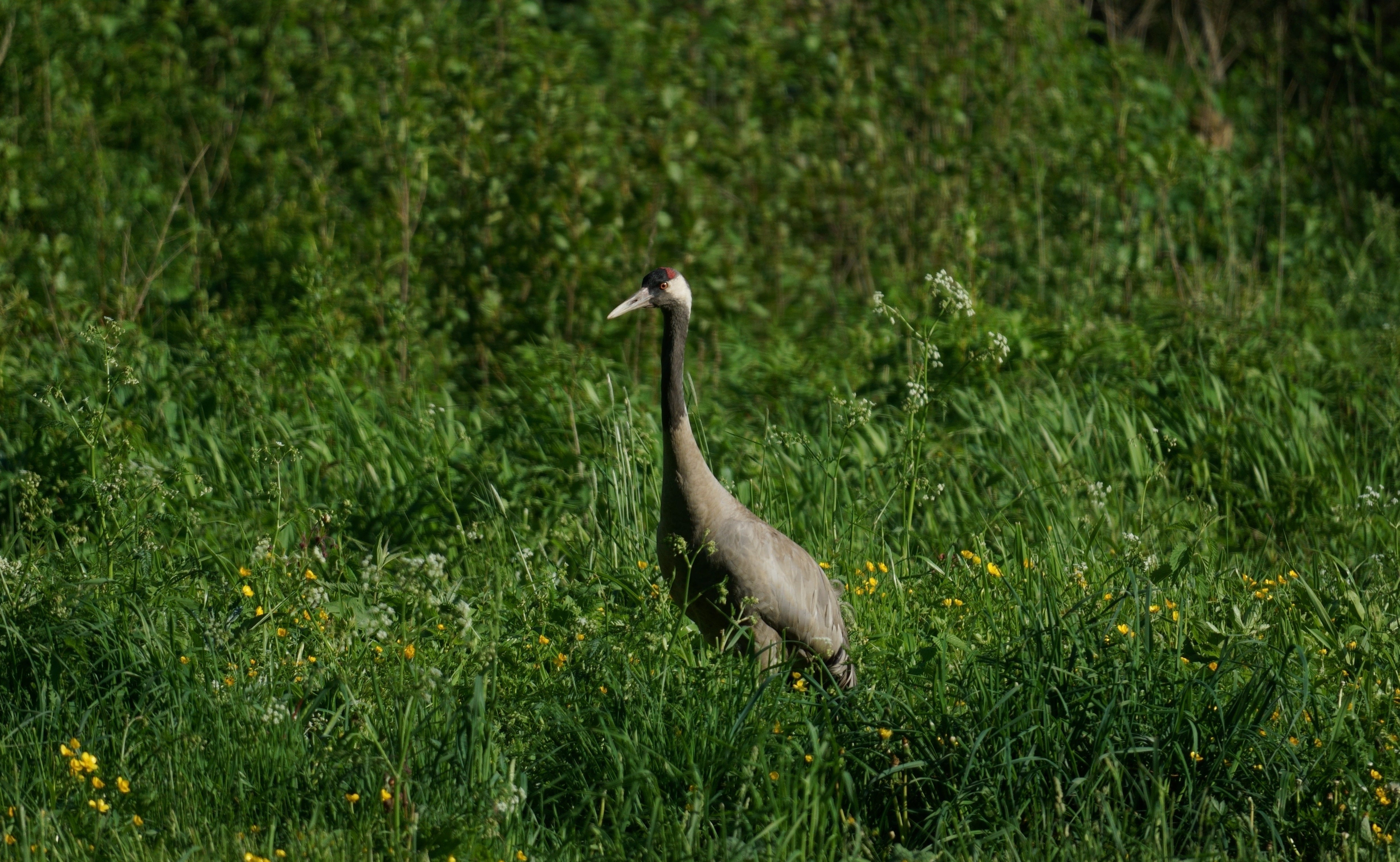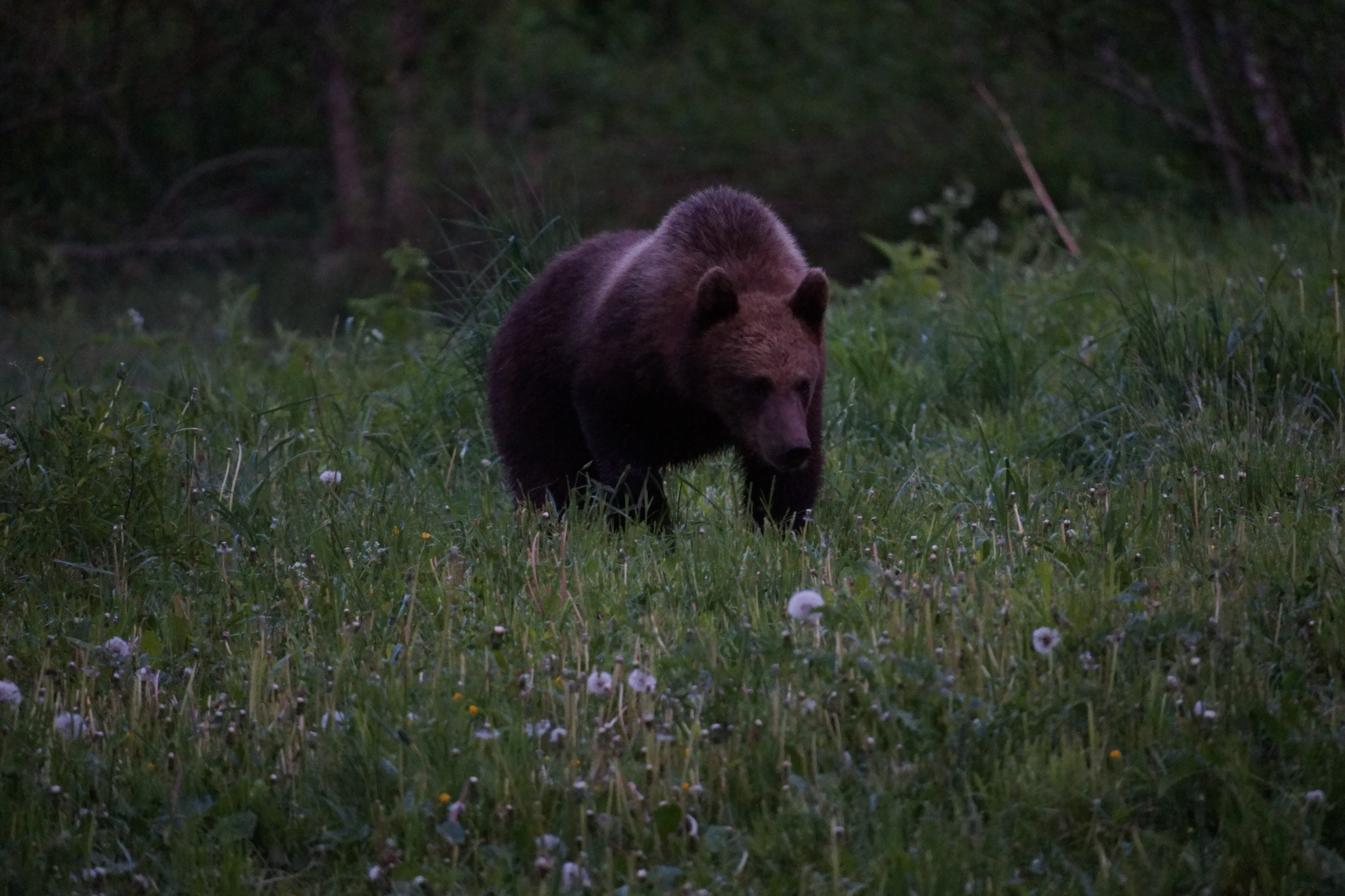 Eventually something larger did arrive, but it still wasn’t a bear. A common crane glided into view, folding up its wings and extending lanky legs to land gracefully in the long grass of the meadow. For a while it stalked about, picking its way carefully up and down the hummocks and dips of the clearing, its neck bobbing down then curling up like a comma as it picked at unseen food on the ground. It soon left, and we entered another period of straining eyes and sweeping binoculars. I resigned myself to the truth that these were wild animals, we may not see any bears at all and that would have to be absolutely fine. Half an hour ticked past. Then another.