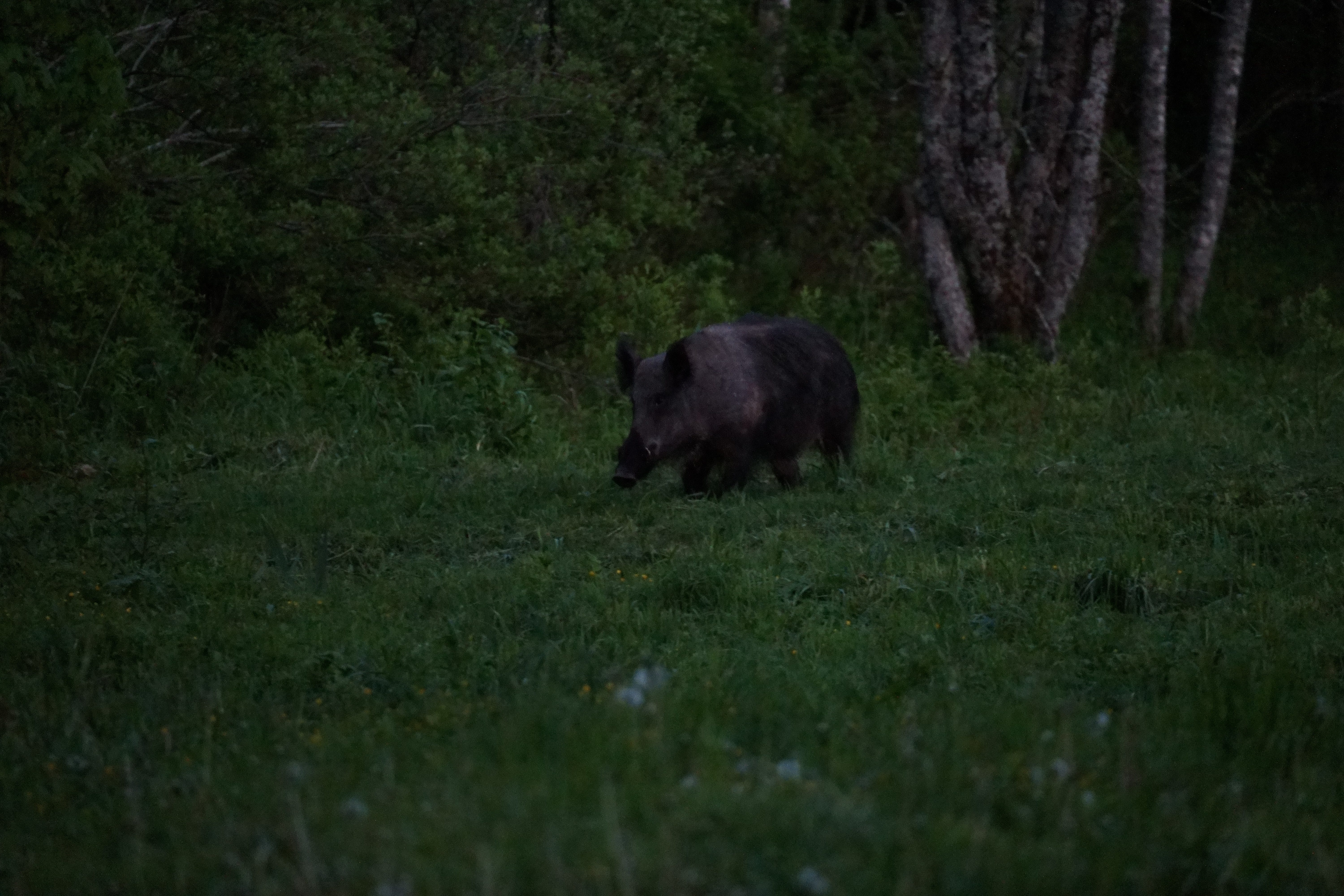 Our next visitor was by far my favourite. Older than the yearling but certainly still a juvenile, his ears seeming enormous, out of proportion to the head that had not yet gained its adult mass. He had the awkward, lanky gait of every teenager, regardless of species, when their body has grown too quickly and they’re not really sure how to deal with all this new, extra limb. His back hump was skinny and extremely prominent and where the adults had lumbered, slow and sedate, he raced from spot to spot, galloping between the trees, full of excitement and unchecked energy. He slipped briefly back into the wood, and was replaced by the long snout of a wild boar. Of all the animals we had seen that night, she was certainly the most aware, I’m sure had the most sensitive hearing. The slightest noise, meerest movement and she would pause mid-step, sometimes doing it so often that it looked as if she were stop-frame animated. Mum thought her binoculars were glitching at first.