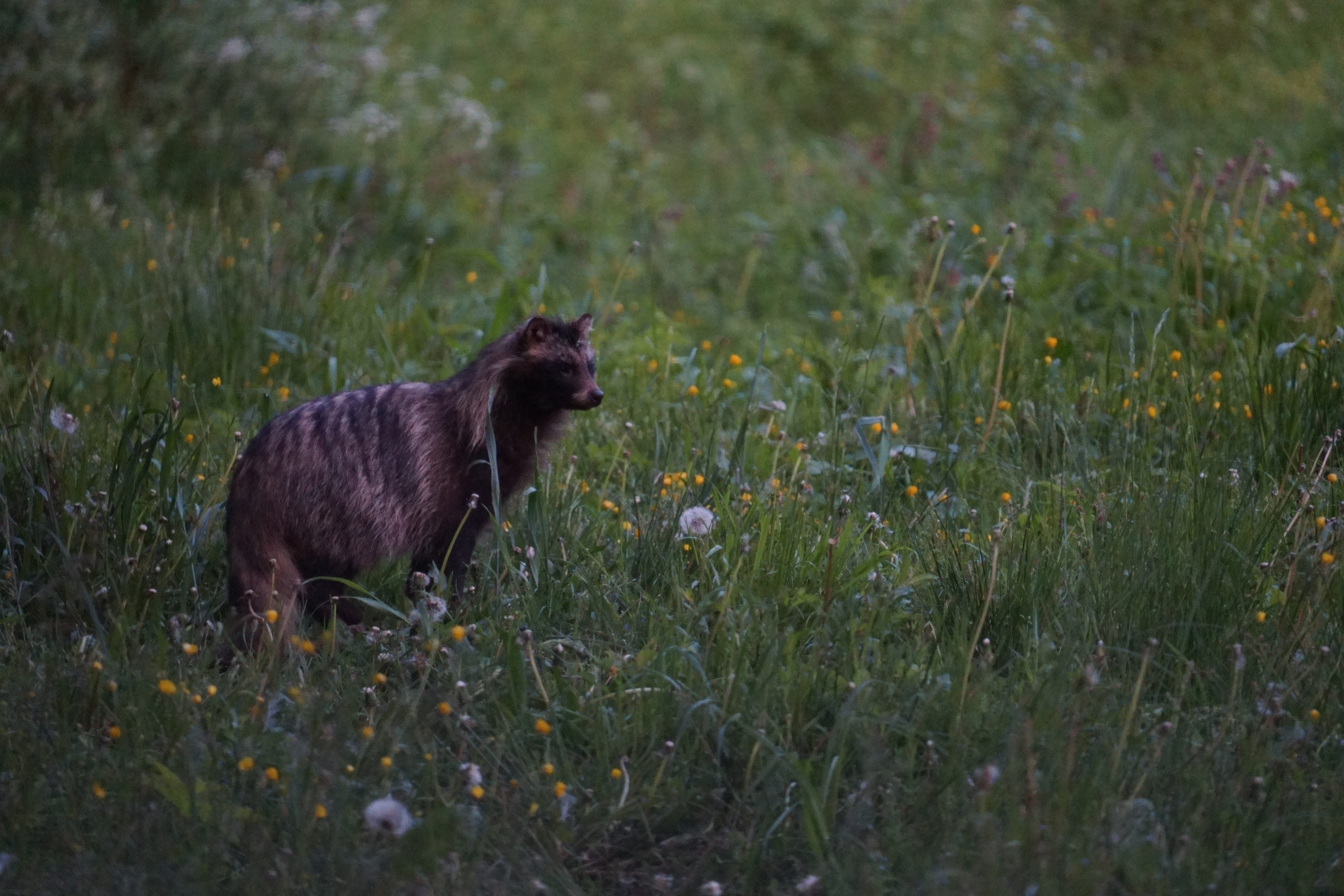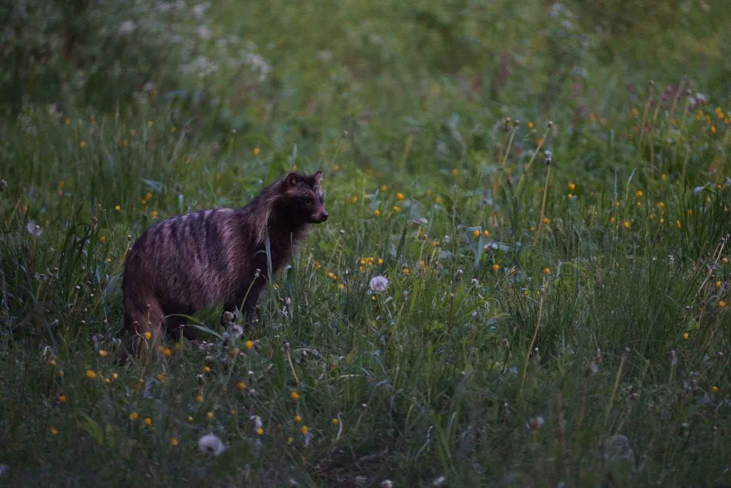 We entered another long period of empty woods, but I didn’t care. It was only 8pm but I would have happily spent the next 12 hours looking at absolutely nothing – we had been beyond lucky, treated to four separate sightings already, and as far as I was concerned, anything else was a bonus. Our first bonus showed up almost an hour later, and I nearly missed them. The light was showing the first signs of fading, and they were far smaller than our previous visitors: a pair of racoon dogs trotted through the long grass of the meadow, with their delicate, fox-like faces and long, brindled fur like a carpet down their backs, they looked like a cross between their more well-known racoon cousins and a Crufts lap dog.33 They seemed more alert than the oblivious bears, and even the slightest sound from us: a slipped elbow, a camera knocked accidently against the window, would elicit a sudden stop and a flicker of the ears, before moving on to rummage through the bears’ leavings.