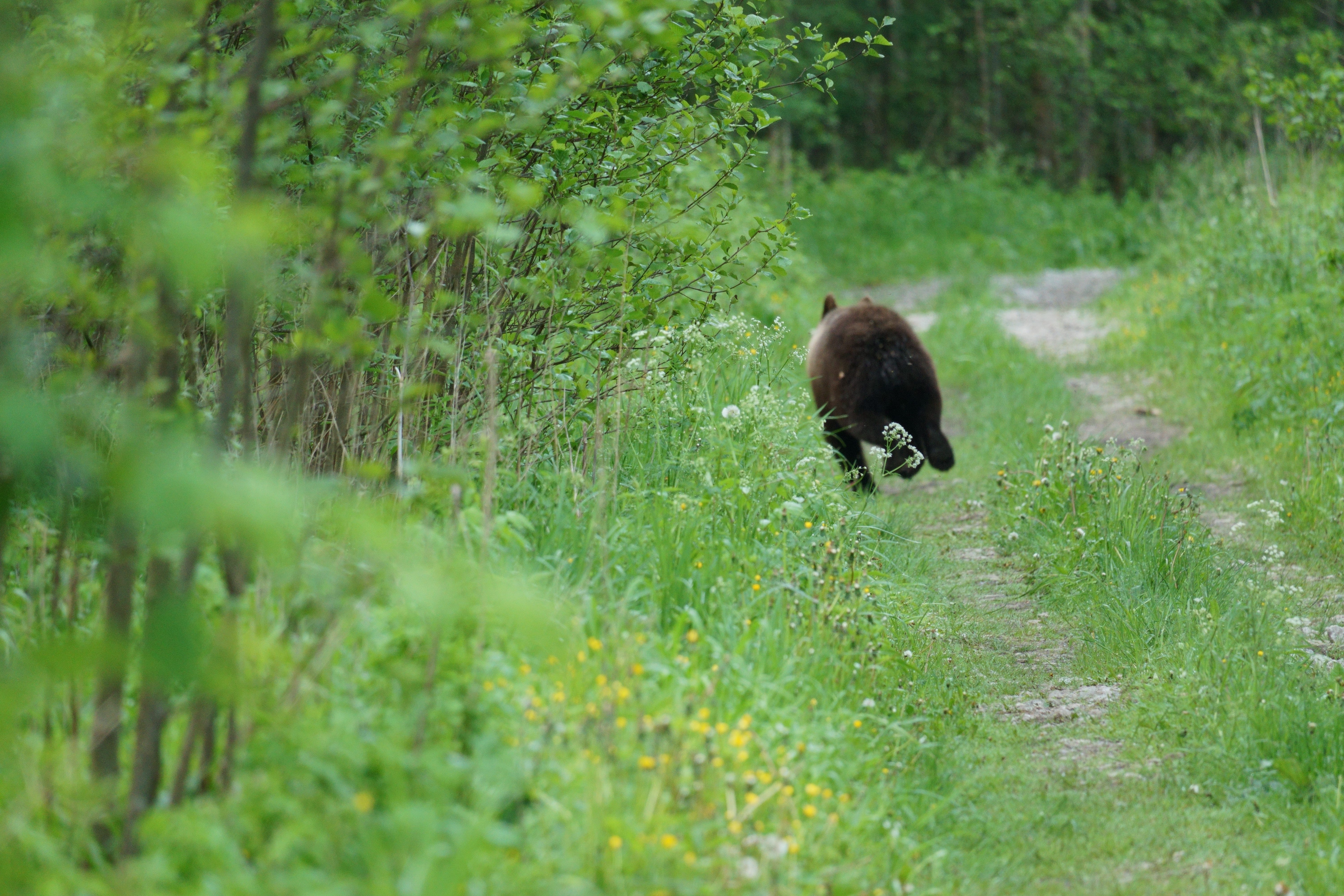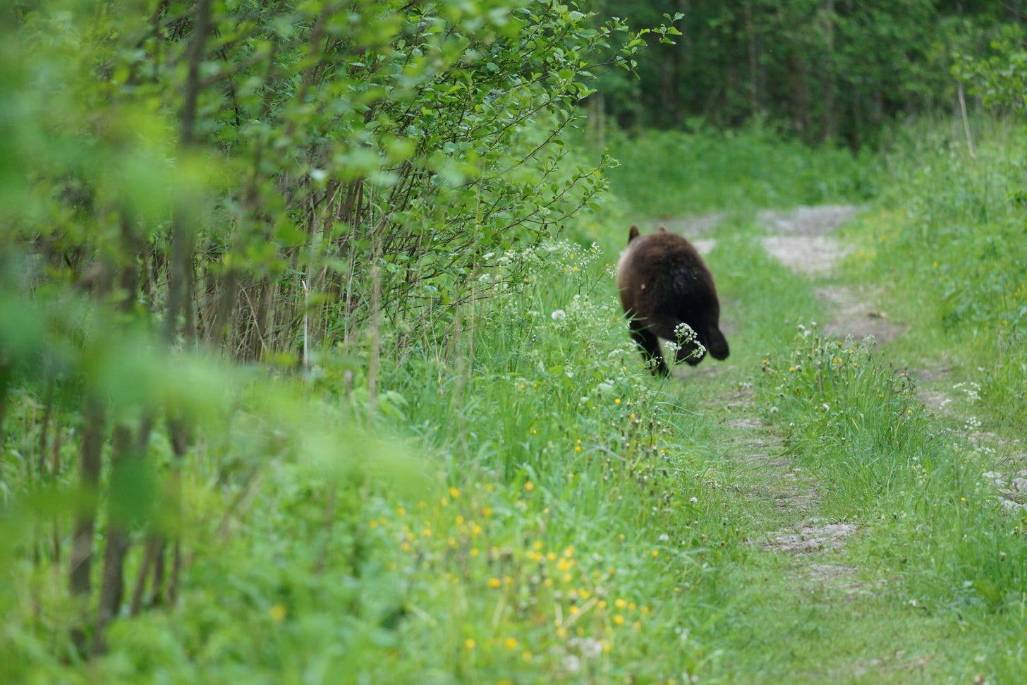 When 8am rolled around, we had to make our own way back to the parking, with untold numbers of bears between us and the car, evidence of their passing pressed into the mud. “Just talk at a normal volume when you leave” the guide had said the night before, “the bears should hear you coming and run away.” He was absolutely right – brown bears are massive scaredy cats, it turns out. Half-way down the trail we rounded a corner to the sight of a large bear not 100m away, taken by surprise. It bolted immediately without a backwards glance, back feet flying up in its haste to return to the safety of the trees. The mosquitoes gave us more hassle, coating every inch of bare skin, flying in behind sunglasses and making a general nuisance of themselves – the first time I’ve ever had a mosquito bite in my hair – and it was a relief to sling the bags into the car and quickly slam the doors behind us.