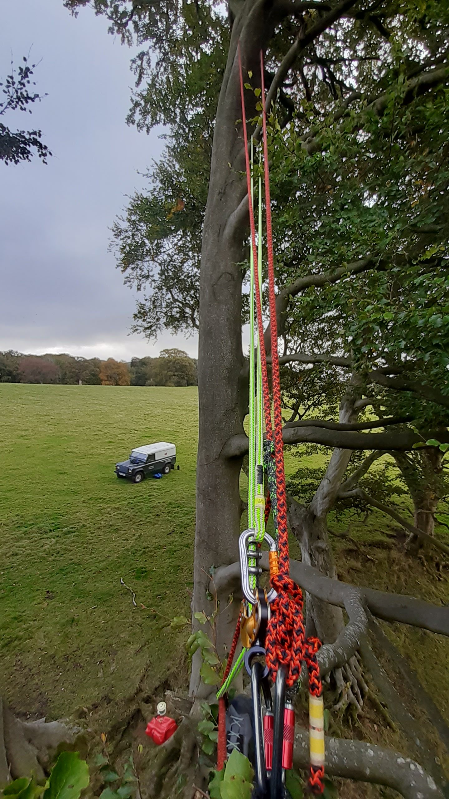 The following day, and with an audience of endlessly curious cows, we started on the practical side. Tossing throwing lines up into branches, setting up anchors and working our way up the trunk and into the canopy. I fell in love with it immediately, though it was not without its frustrations. Throwing my ropes up to the next branch proved to be a real sticking point for the first day or so – my shoulders might be conditioned from rock, but my aim was absolute garbage until I found the knack of it. But the triumph of sticking the throw, the feeling of hauling straight up the ropes, walking up the trunk and tossing a leg up above my head to hook the next branch and slide onto it, each movement was a joy. The only time nerves hit were the first couple of branch walks I did – edging away from the security of the main trunk, not balancing on top of, but pressing out from, smaller and smaller limbs. Habit wanted me to balance on my toes, not press the middle of my stiff boots into the branch, which made for slow and cautious progress. By the second day though, even this felt comfortable. I wanted to get further and further out, lose myself in the thickening leaves, confident in the systems that held me.