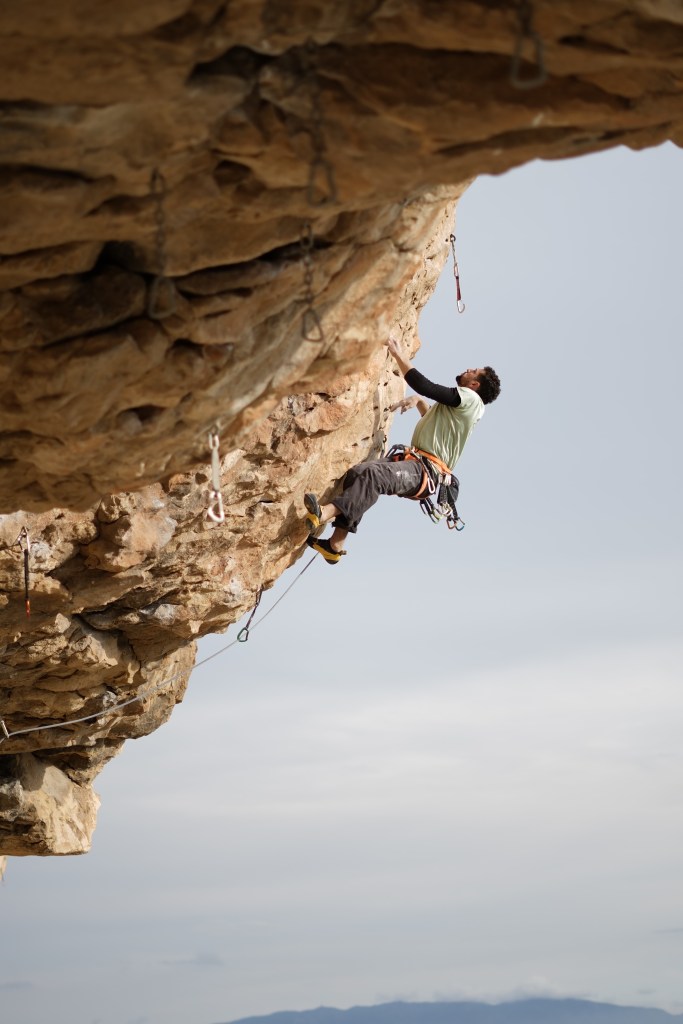 To call it steep would be an understatement – imagine instead a 40-50 degree training board of your choice, but just riddled with jugs. The limestone here is folded and wrinkled like the skin of a giant shar-pei, which has given rise to an abundance of jugs. Buckets. Handles. Sinkers. Whatever you want to call them, they’re everywhere and they’re absolutely fantastic. In the main cave, each of the routes start almost horizontal before curving round cruxy boulder sections and up onto the headwall. The most accessible in this section is the lovely jug fest Hermanas (7b), but the much harder Libertad (7b+) next door is a satisfying fight through kneebars and pockets up on to a technical face climb. There’s even a 7c that traverses all the way across the roof of the cave, an exploration of the fully horizontal. My favourite though, had to be Ramera (7b+) 25 metres of 40o overhang, a pure battle of will and endurance with more buckets than a garden centre.2 If I could point to any climb and say “this has been specifically designed for me”, it would be this one. Climbing it in the full sun I was in my element. And while Chris sweated on the belay, I felt solar-powered as I rode the rising wave of pump all the way up to the final wide, very droppable move, and the chains.